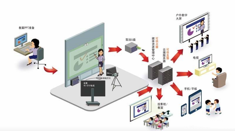 教學視頻應用服務云平臺、嵌入式高清錄播系統、圖像跟蹤系統、高清攝像機、全向拾音系統、控制及分配系統、控制面板及講臺等。